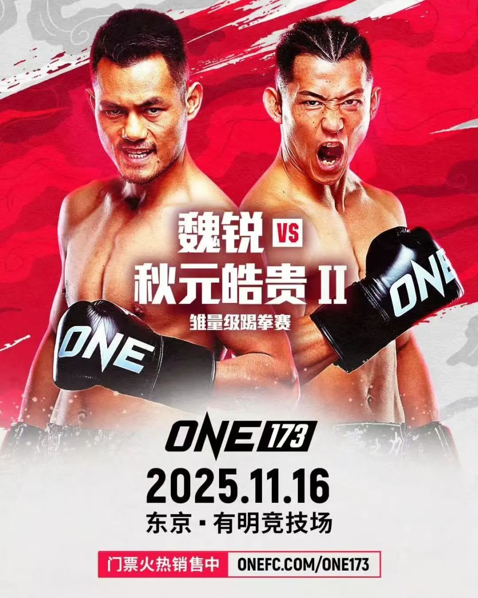 ONE冠军赛官方于今日宣布,在11月16日的ONE 173日本东京站比赛中,中国选手魏锐将与前冠军秋元皓贵展开二番战。